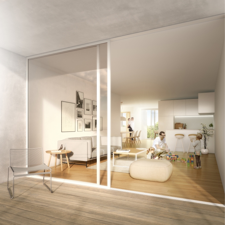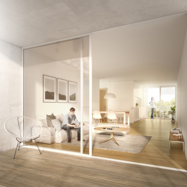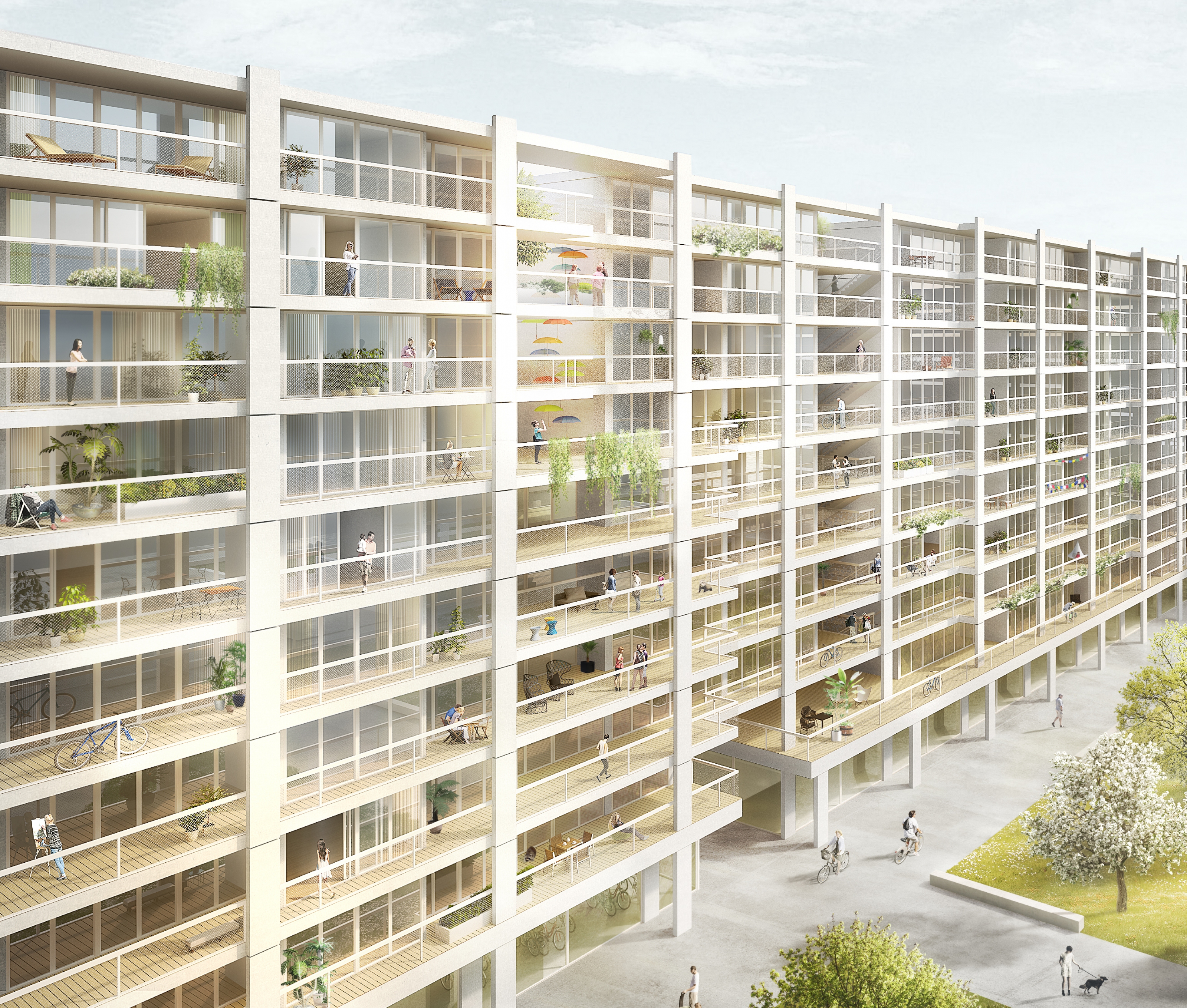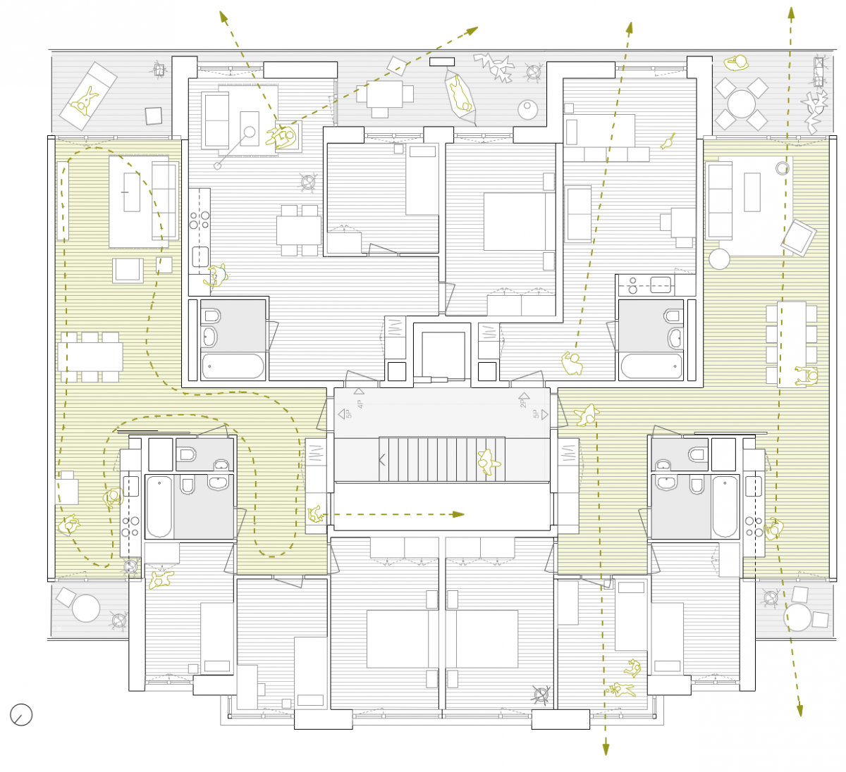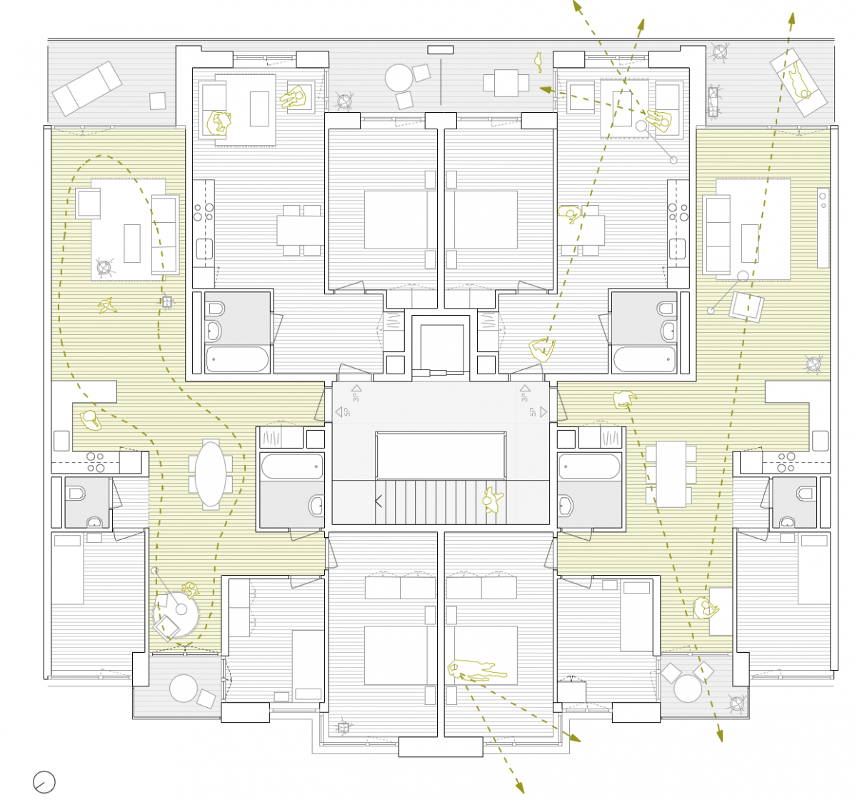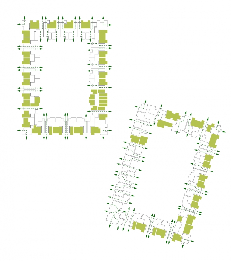 Dans cette forme urbaine issue d’un concours d’urbanisme, le parti favorise de manière générale les appartements bi-orientés où la question typologique va plus loin que la terminologie du traversant. En effet il est proposé que presque tous les appartements de cette catégorie possèdent un espace qui permette une vue intérieure, de la rue à la cour, et soit agrémenté d’un prolongement extérieur.
