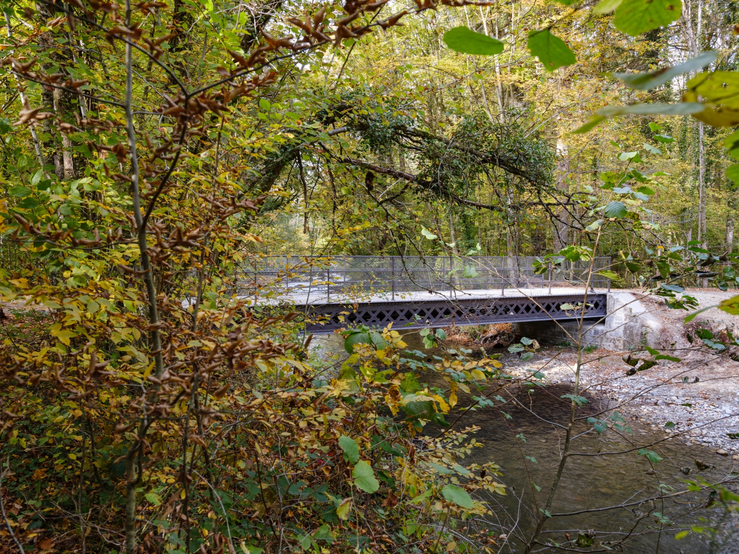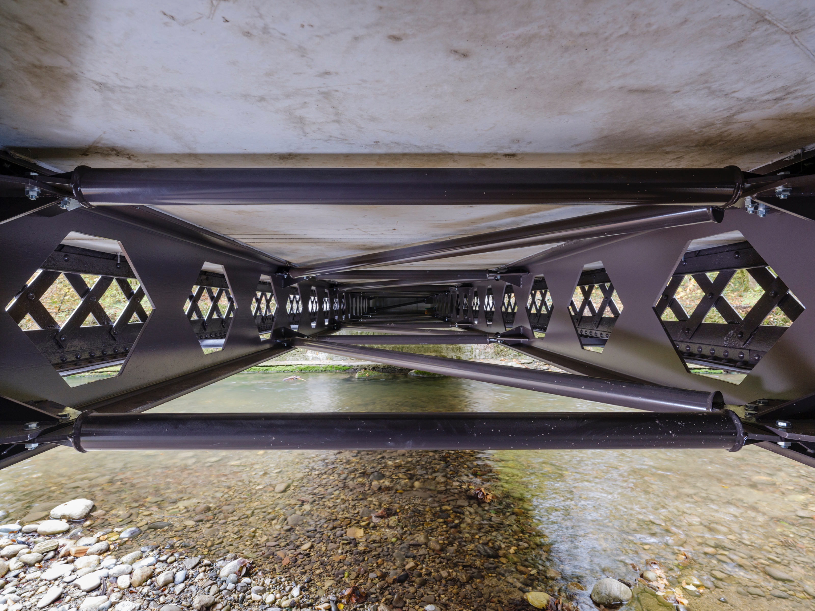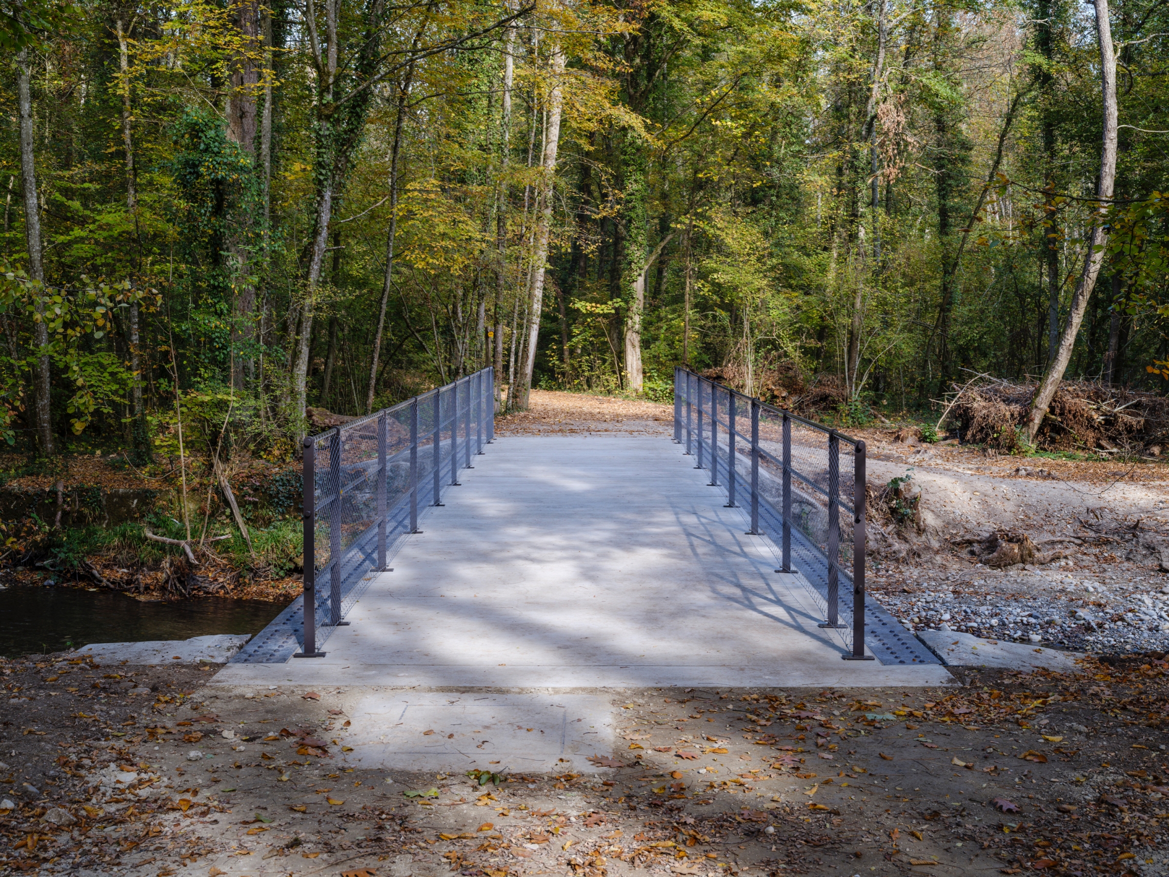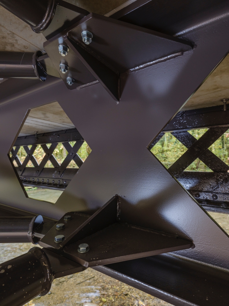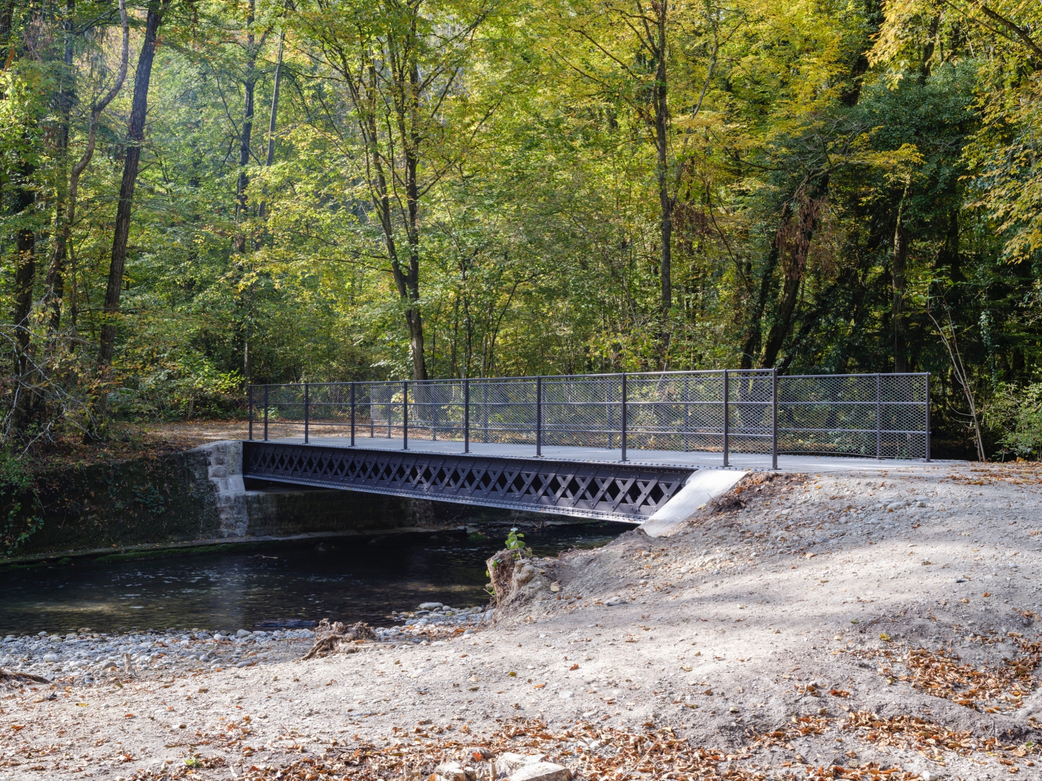 Pour répondre aux enjeux statiques, une nouvelle sous-structure en acier contemporain remplace celle des années soixante dans l’optique de mettre en valeur les poutres rivetées d’origine remises dans leur position initiale. Les garde-corps sont reconstruits à l’identique d’après les photos du début du XXème siècle ainsi que les percements retrouvés sur les poutres. Le dispositif est complété d’un filet en inox tressé in situ qui répond aux enjeux de sécurité et des crues de la zone alluvionnaire. Enfin, une étude stratigraphique a permis de revenir à la couleur ‘taupe’ d’origine en parfaite adéquation au contexte.