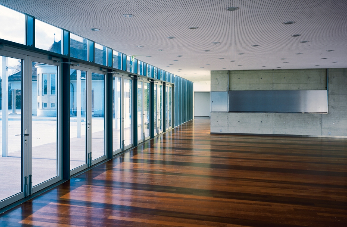 Le nouvel objet architectural se démarque de l’existant par sa matérialité, un 'prisme pur' en verre. Son écriture résolument contemporaine dialogue avec l’ancienne salle 'Genoud', sans entrer en concurrence avec son expression architecturale caractéristique d’un langage 'proto-moderne'. Au mur en crépi rustique, percé de fenêtres à la française, répond une peau en verre translucide, scandée par le rythme vertical des montants en aluminium éloxé. A l’éclairage naturel donné par l’alternance 'plein-vide' de l’une, coïncide une lumière diffuse et constante, conférée par le traitement à l’acide des vitrages.