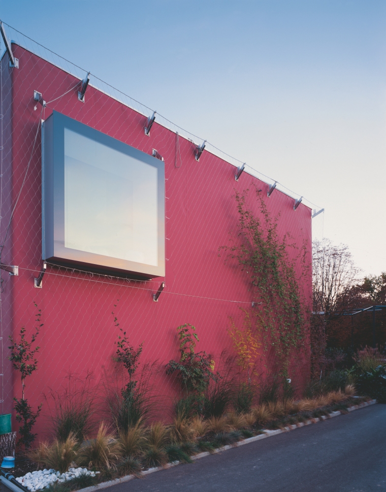 La villa est végétalisée afin de répondre à la situation particulière du lieu et pour rendre compte de la situation professionnelle du Maître d’ouvrage qui exploite la terre agricole dans la région. Un grillage en fils d’acier inoxydable est tendu en avant de la peau thermique et sert de support aux plantations grimpantes.