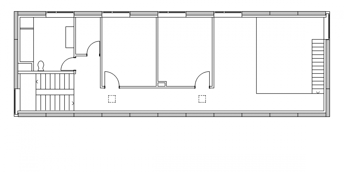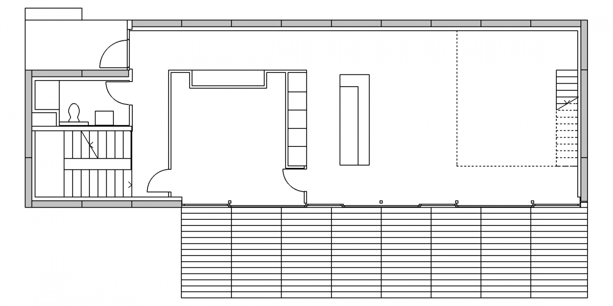 Une longue baie vitrée au rez-de-chaussée ouvre les pièces de jour sur une terrasse en bois vers le jardin. A l’étage, la coupe s’inverse pour ouvrir les chambres à l’est par de grandes fenêtres carrées. L’entrée de la villa est marquée par un évidement du volume sur l’angle Nord.