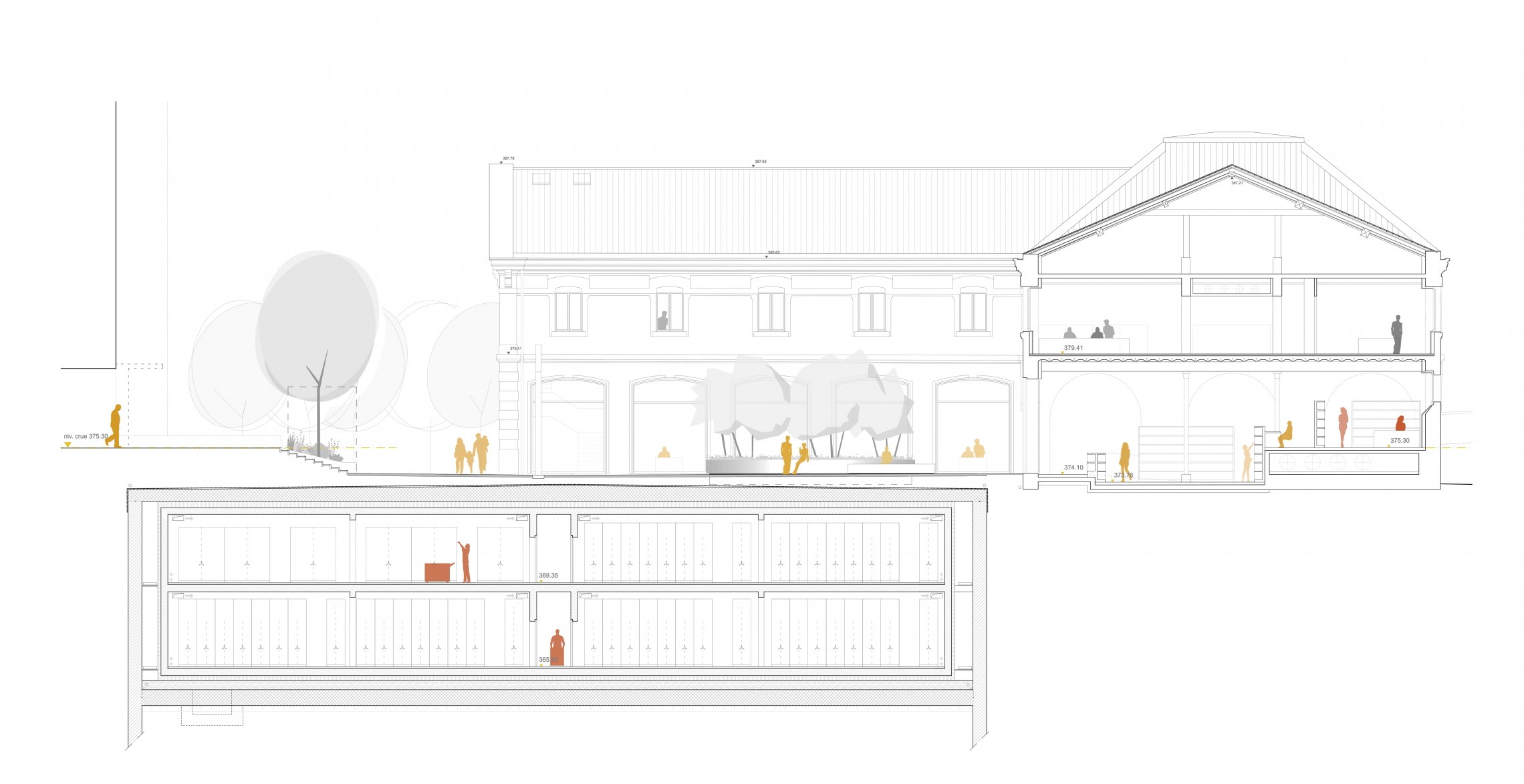 Les activités professionnelles sont disposées le long des façades rues relativement fermées, sur des planchers rehaussés qui permettent de disposer les places de travail à la juste hauteur des canonnières existantes et sous lesquelles court une galerie technique. La mise en place de ce niveau de référence ‘’professionnel’’ réhaussé prend assise sur une autre contingence du programme: tenir compte des crues exceptionnelles pour sécuriser les ouvrages et s’affranchir de venues d’eau dans les dépôts enterrés.