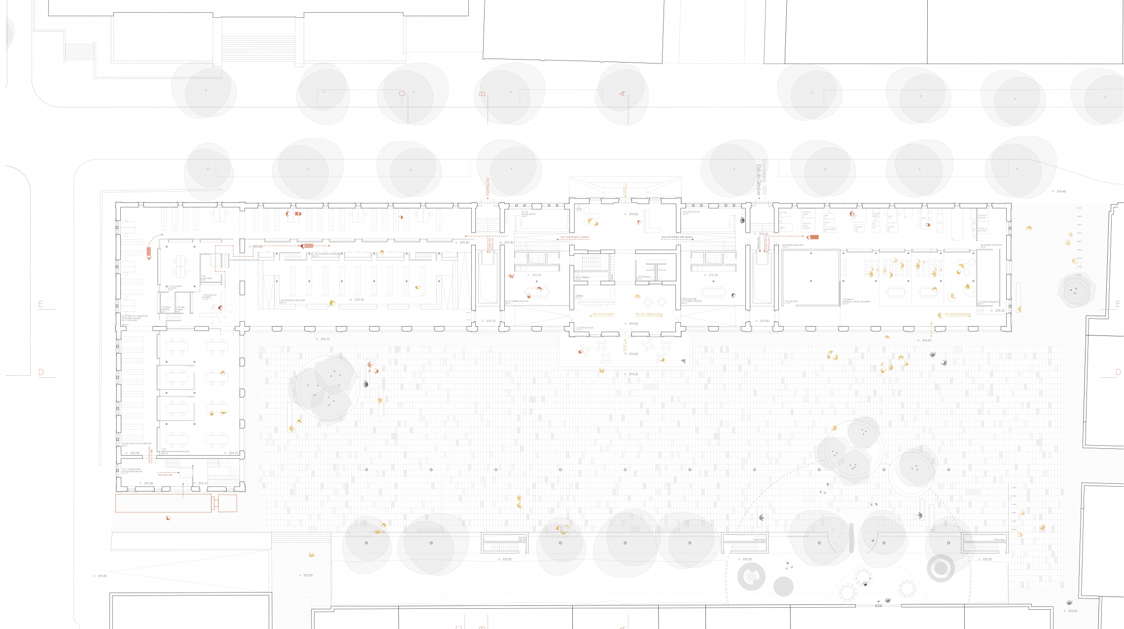 D’un point de vue fonctionnel, il s’agit de mettre en place un outil des plus performants au service de plusieurs usages, de disposer les éléments du programme en concordance avec la spatialité de son contenant, d’articuler les espaces dédiés aux archives avec l’espace public dans un juste équilibre entre le donner à voir et la préservation des bonnes conditions de travail du personnel des archives. Tous les espaces à vocation publique sont implantés sur cour, dans une succession de séquences disposées en crescendo entre le plus public et le plus sécurisé, entre le plus ouvert et le plus calme: l’accueil dans le corps central, la cafétéria, la bibliothèque, puis la salle de lecture, en bout de parcours, à l’endroit le plus préservé du bâtiment d’origine.