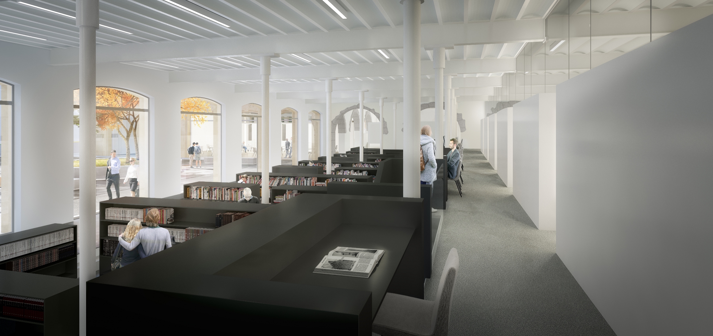 A l’intérieur, le projet propose la restitution et la mise en valeur de la substance patrimoniale de l’édifice dans les espaces publics. Ainsi, les colonnes métalliques forgées et enrobées de béton du rez-de-chaussée sont remplacées par des nouvelles colonnes présentant un élancement comparable. Le système porteur horizontal composé de poutres rivetées et de voutains longitudinaux est conservé et mis en valeurs dans les espaces majeurs.