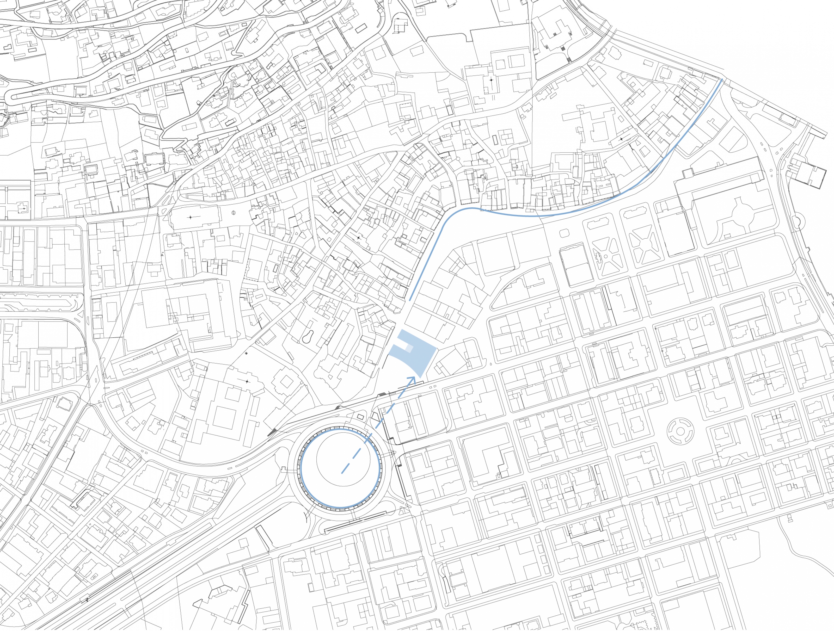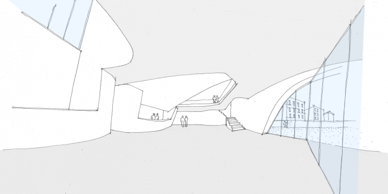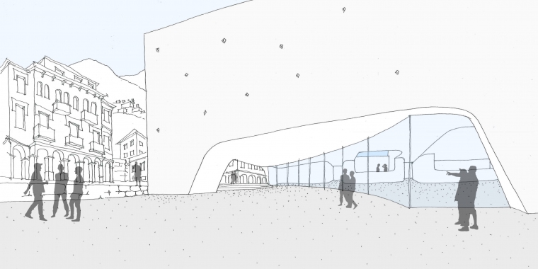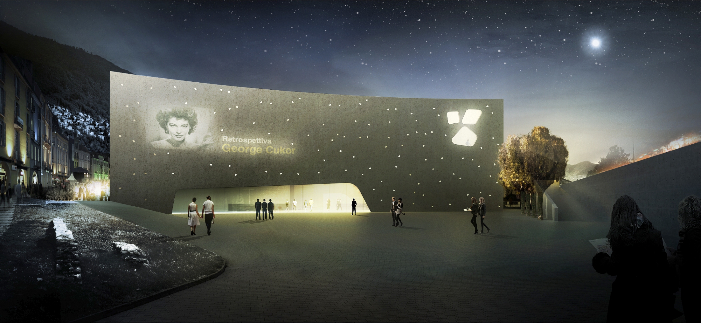 Une forme rectangulaire simple s’inscrit sur la parcelle se laissant déformer dans sa face principale par une courbe qui accueille la collectivité, et le paysage urbain. Un passage public, à l’image des arcades de la vieille ville, prolonge les parcours venant de la Piazza Grande et de la piazza Castello pour accueillir les passants. La façade évoque l’écran de cinéma et la promesse de festivités.