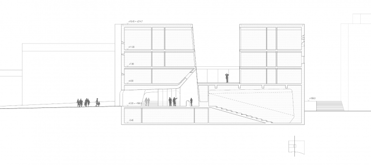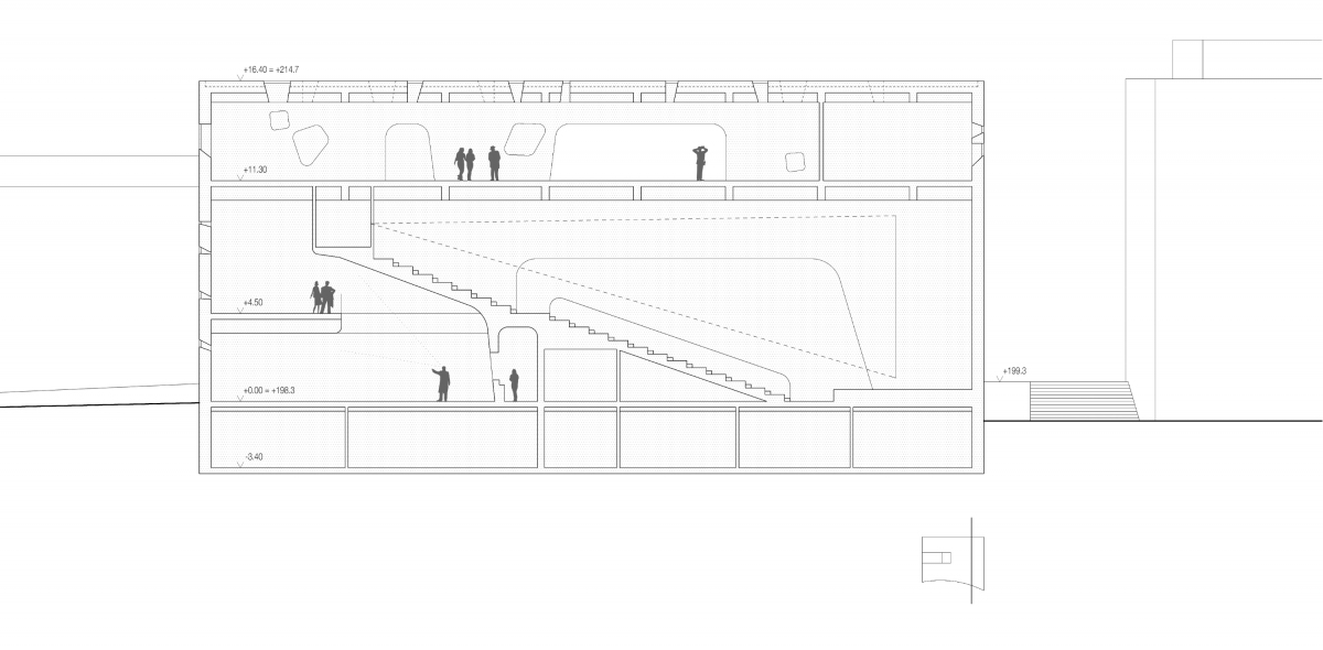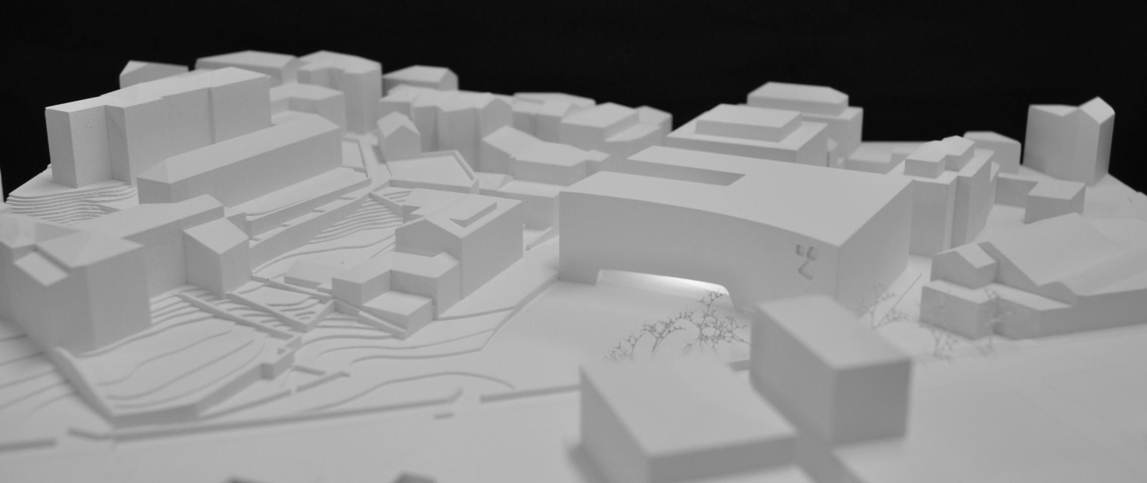 Dans une volumétrie d’une échelle réduite plus adaptée, l’administration et l’école se déploient autour d’un même patio aux premier et deuxième étages pour l’administration, au troisième étage pour l’école en lien avec l’espace polyvalent. Des escaliers se situant au Nord du bâtiment aménagent des entrées directes (privées) pour l’administration et l’école depuis la via Conturbio. Le projet se veut simple dans son expression et dans sa mise en oeuvre. La dimension de l’objet urbain créé et donnée par le programme nécessite une réflexion quant à l’expression architecturale de ce volume vis-à-vis de la collectivité. Le langage choisi évoque le mimétisme d’une minéralité qui cherche à se fondre dans la ville de Locarno. Ici un double mur en béton couleur sable évoque l’écran géant, un monde immatériel aux multiples visages.