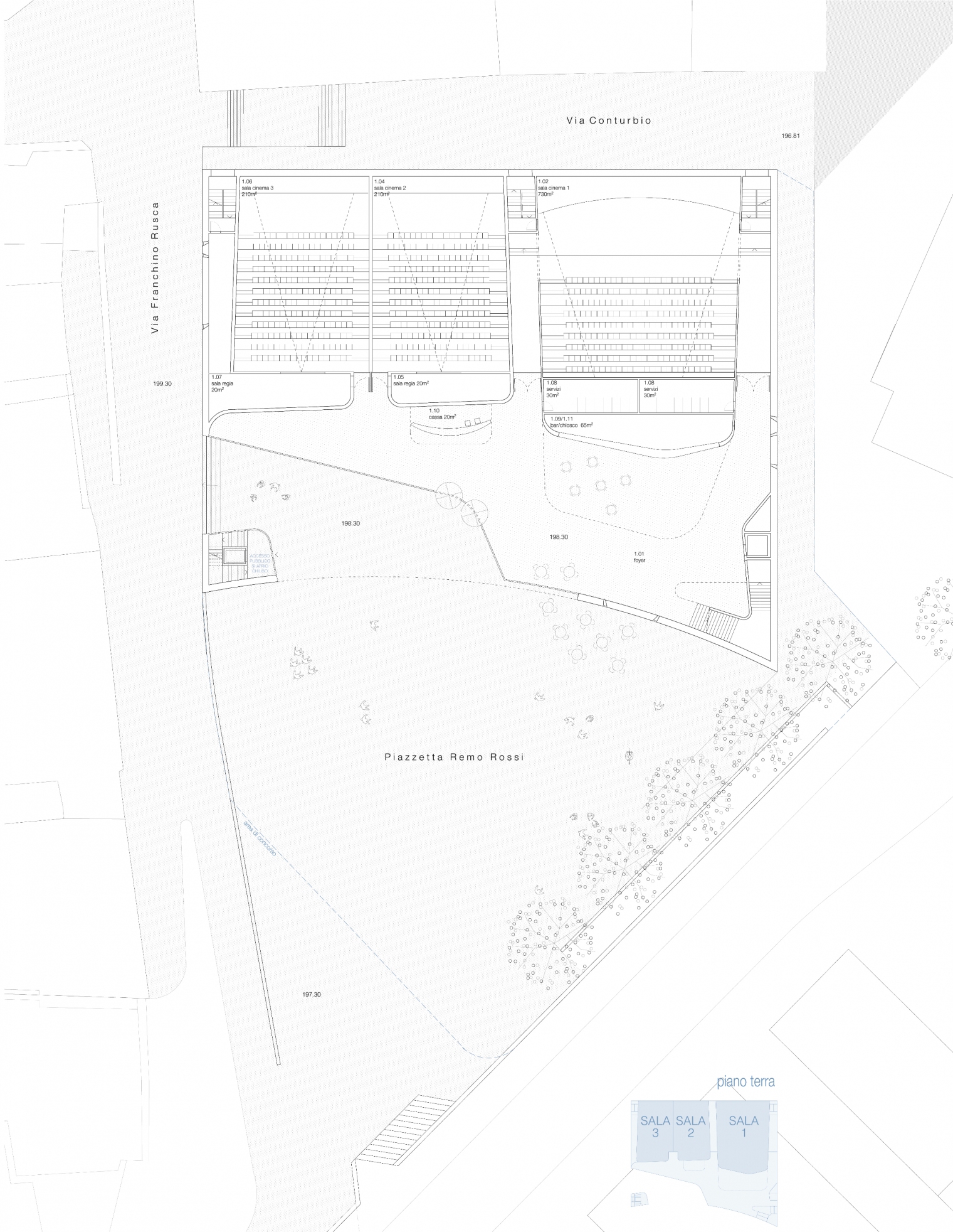Le palais du cinema accueille trois salles de projection au rez-de-chaussée en lien direct aux espaces public du centre de la ville. La grande arcade couverte donne à voir le foyer depuis la via F. Rusca et depuis la piazza Castello. Un accent de lumière issu du patio anime cet accueil et oriente les visiteurs.