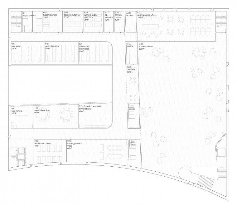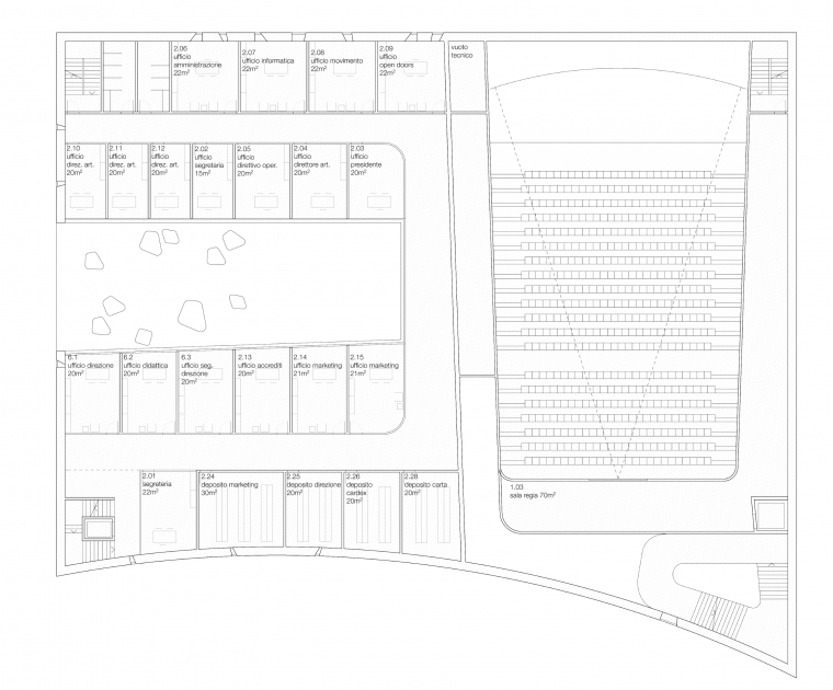 Un foyer généreux prolonge la piazetta Remo Rossi à l’intérieur du bâtiment offrant des espaces de détente : bar, lounge et boutique dont la spatialité du mobilier dirige vers les salles. Un escalier public à l’Est relie, selon les besoins, les autres activités collectives du bâtiment : foyer au premier étage pour l’entracte et la salle polyvalente au troisième étage pour d’éventuelles expositions ou cocktails sur invitation.