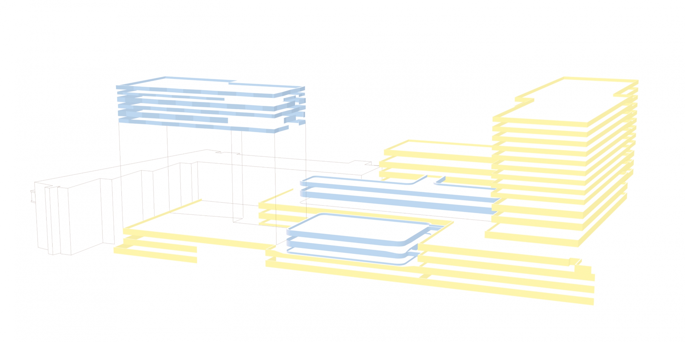 Le contexte architectural dans lequel s’implante le bâtiment du bloc opératoire préfabriqué est constitué d’interventions successives d’époques, de factures et de gabarits divers. Ce contexte hétérogène présente néanmoins certaines permanences. Tant le bâtiment de l’extension du restaurant que celui de l’extension du CCO reprennent le thème des bandeaux de contrecœurs minéraux en alternance avec les bandeaux des vitrages, confirmant ainsi le registre horizontal et fluide de la composition initiale.