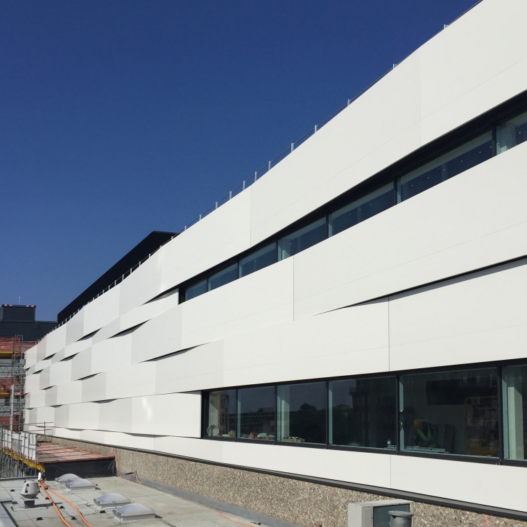 Le choix de panneaux composites en aluminium pour matérialiser cette expression permet de répondre aux multiples exigences de la situation: poids, dimensions, planéité, degré d’incombustibilité. Au caractère minéral et pérenne des bandeaux horizontaux des bâtiments existants s’oppose ici le caractère plus léger de cette nouvelle peau métallique. Pour autant, le choix chromatique des panneaux cherche plutôt un apparentement avec la teinte des panneaux de béton fibré des deux autres surélévations.