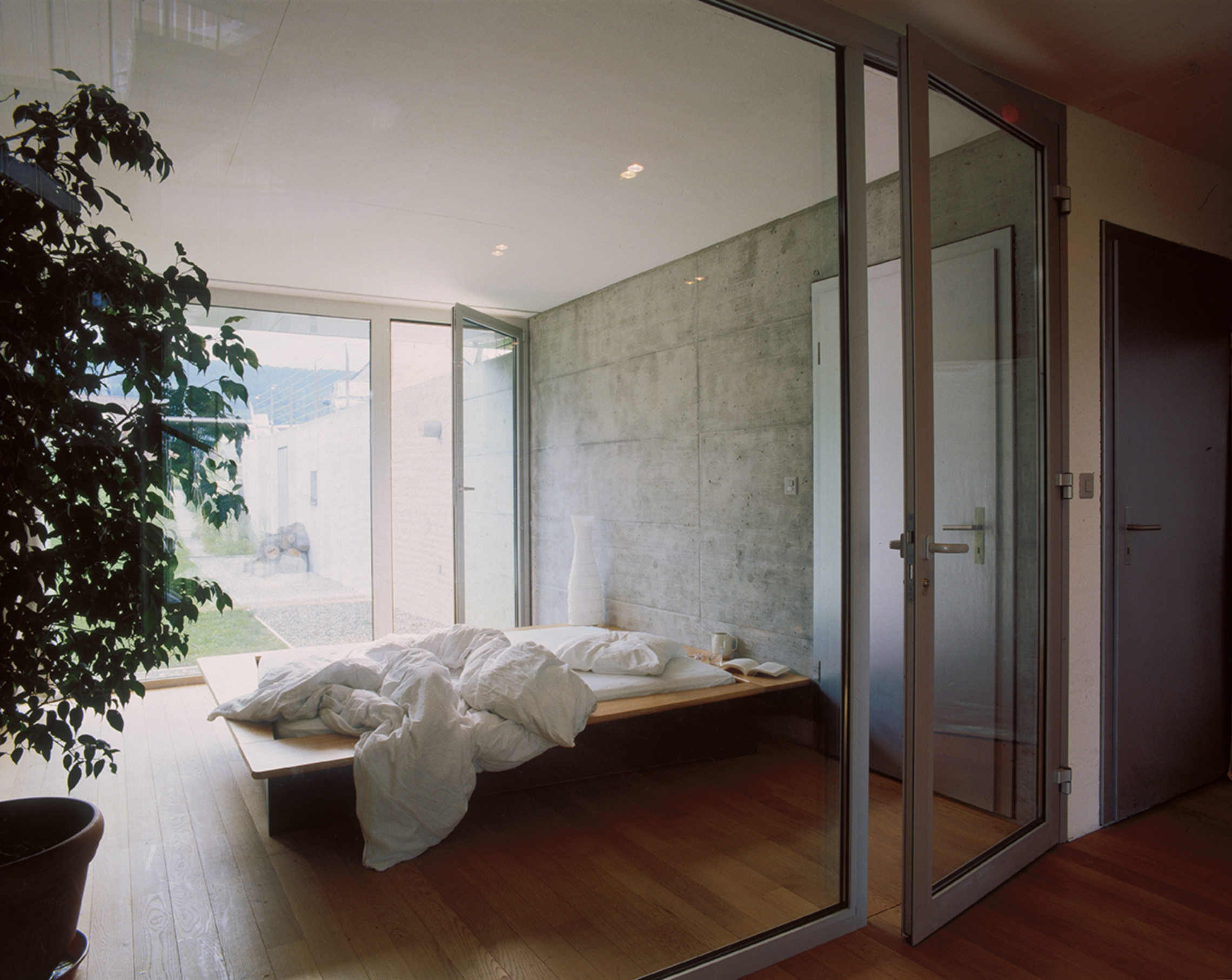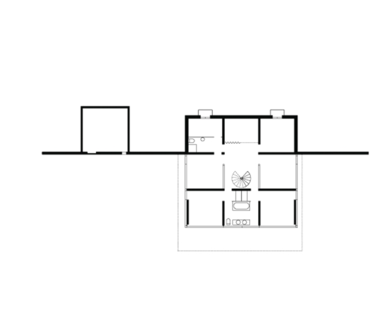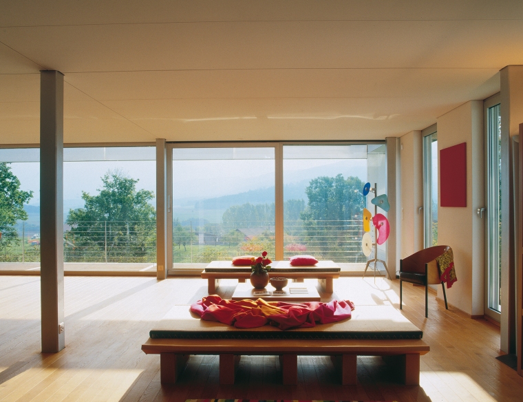 Composé de neuf champs carré et porté par seize colonnes en acier, l’étage de référence accueille les espaces de jour sous forme d’un grand « loft ». Le plan carré permet à la fois d’affirmer l’unité de l’objet et son autonomie, tandis que la composition du plan libre rend compte des situations par rapport à l’environnement naturel et construit.
