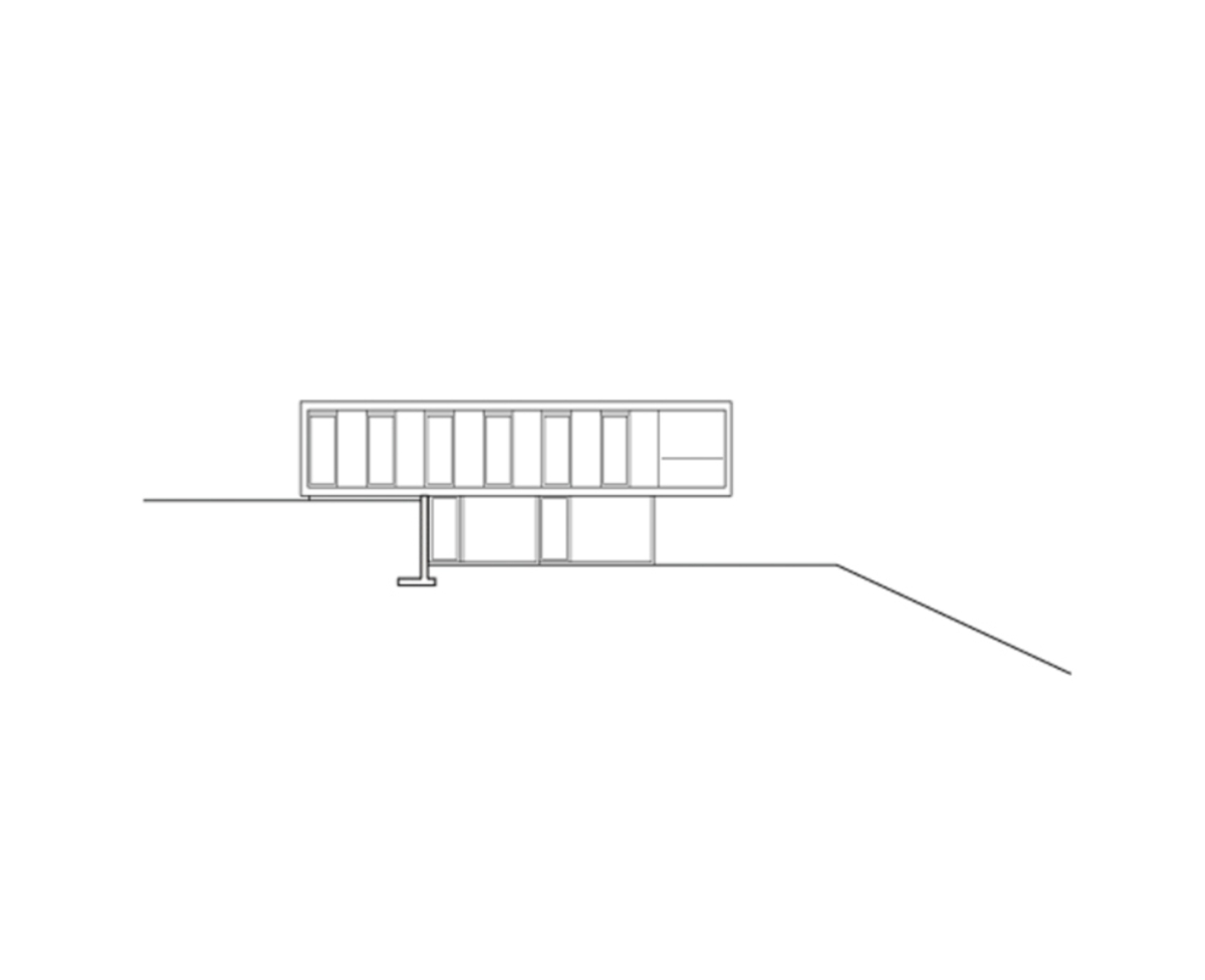 L’étage d’entrée, sorte de piano nobile, se détache du sol avec une composition plastique exprimée par des cadres en acier inoxydable qui redonnent une échelle d’ordre territorial, en relation avec la nou- velle morphologie de la parcelle. A l’intérieur de ce dessin premier, les façades sont constituées par une alternance de panneaux pleins et de vitrages. La façade d’entrée est matérialisée par une peau opaque en inox, percée de la seule porte d’accès à la maison.