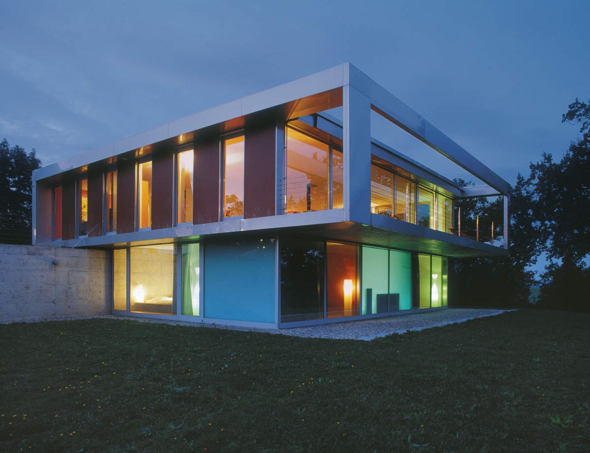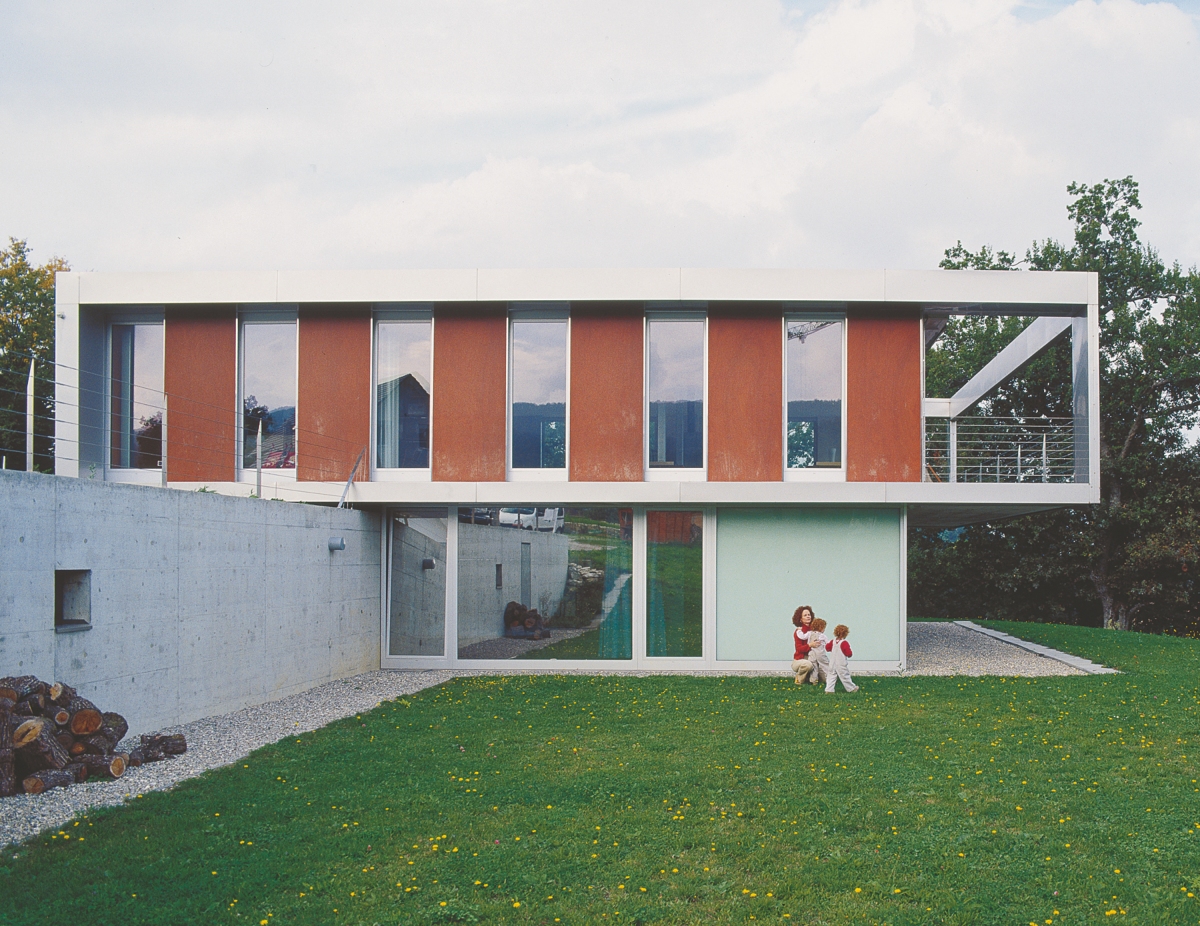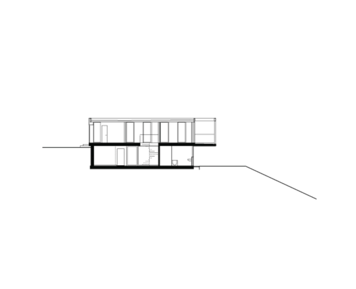 En limite d’une petite zone résidentielle, sur les der- niers contreforts du Jura, l’habitation se positionne face au paysage. Le volume est traversé dans son niveau inférieur par un mur de contention en béton armé. Sur cet étage, en relation avec la partie basse du jardin, sont situées les deux chambres, ainsi que deux espaces d’usage polyvalent. Ces derniers sont placés devant le mur et leur caractère transparent permet de lire la continuité intérieure-extérieure.