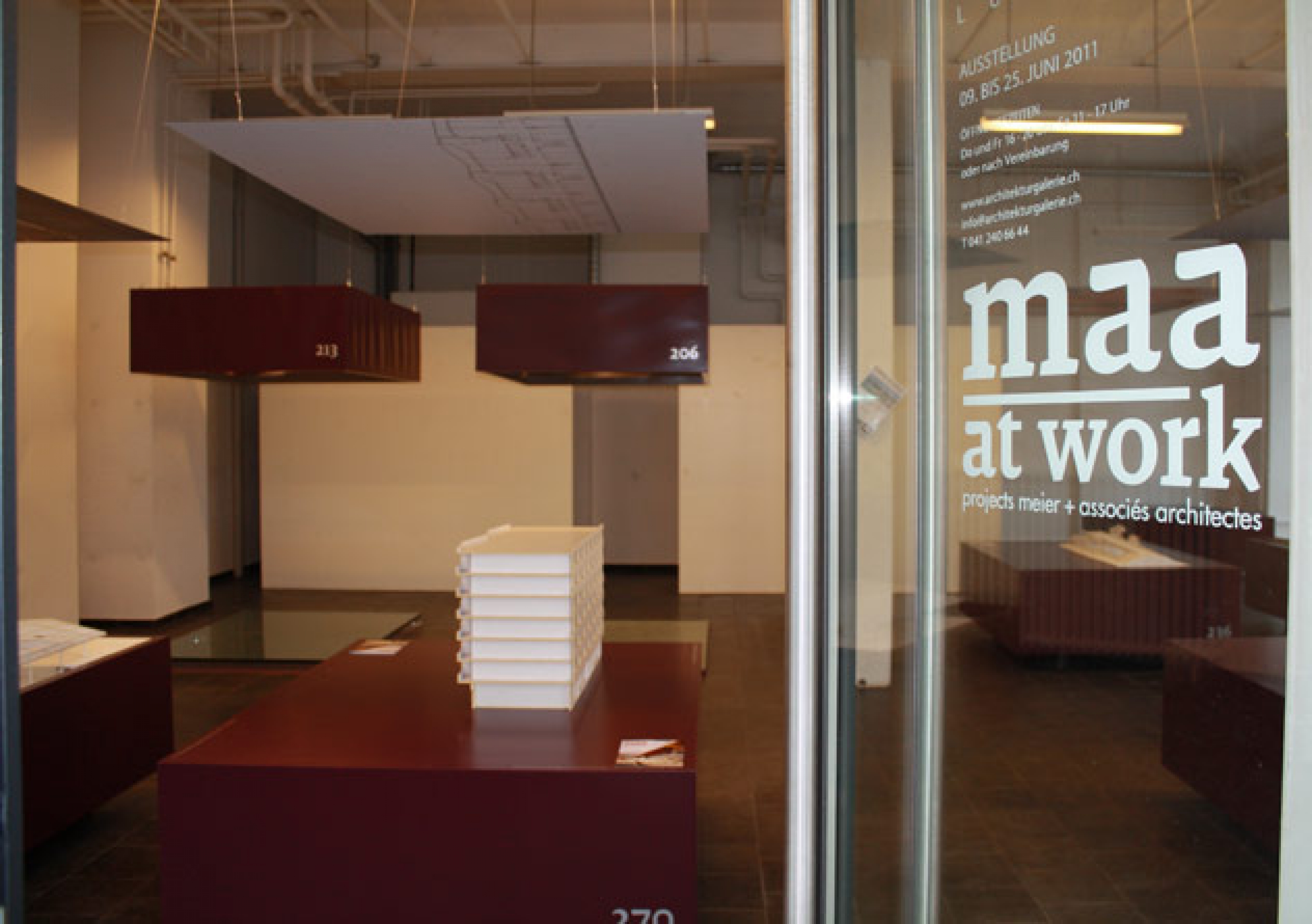 l’exposition ‘maa at work’ prend possession de l’Architekturgalerie à Lucerne. dans ce lieu au centre de la ville, les blocs de couleurs qui supportent les maquettes et les illustrations des projets de l’agence sont présentées sous forme d’un alignement en damier régulier.