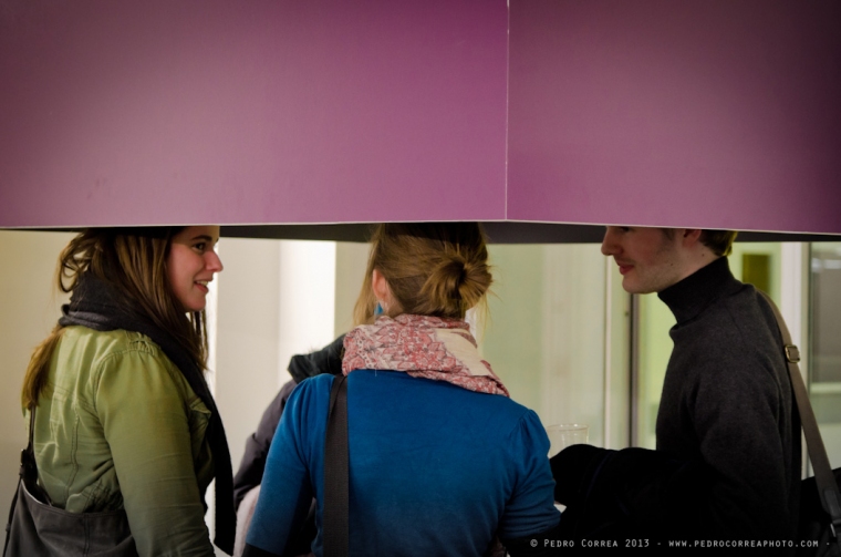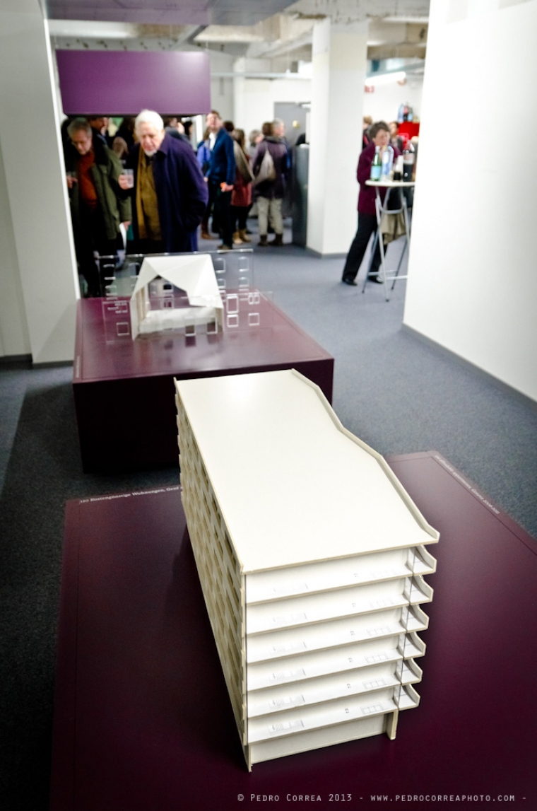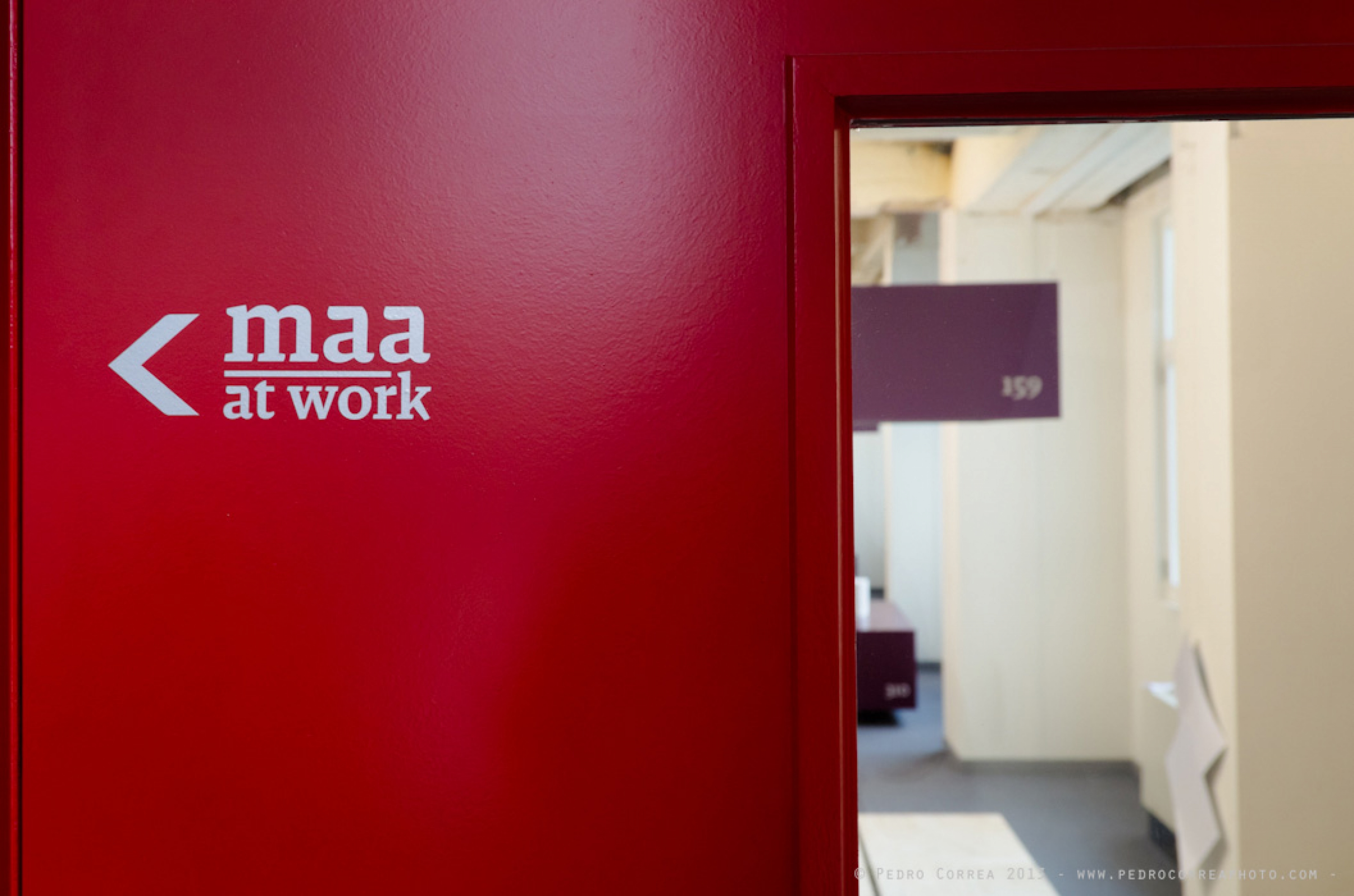l’exposition se déroule sur le site loci de bruxelles, dans le quartier de saint-gilles. le bâtiment est occupé sur plusieurs étages par l’exposition ‘maa at work’. une grande affiche se déroule sur quatre niveaux dans la cour couverte de l’école d’architecture. les maquettes et les illustrations des projets de l’agence sont présentées dans leurs supports d’origine.